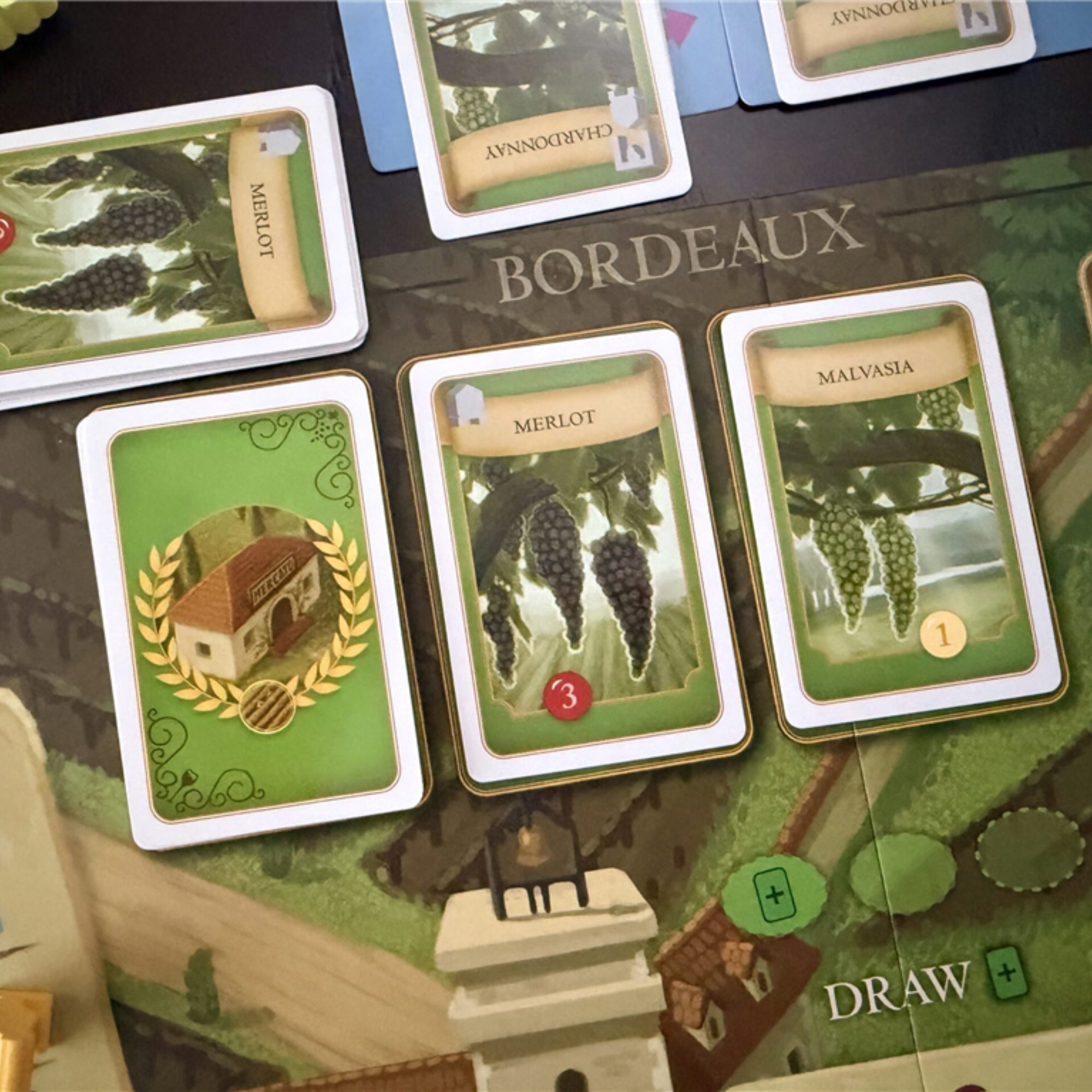De Bordeaux-borduitbreiding voor Viticulture biedt spelers een vliegende start, 4 volledige worker-placementseizoenen, een wake-upspoor vol voordelen, een belangrijke nieuwe expertactie die een actie permanent voor jou verbetert, herzieningen van bestaande acties, een handelsmarkt, openliggende wijnstok- en wijnbestelkaarten waaruit je bij het trekken kunt kiezen, en een eindspelconversie van druiven, wijn en munten naar overwinningspunten.